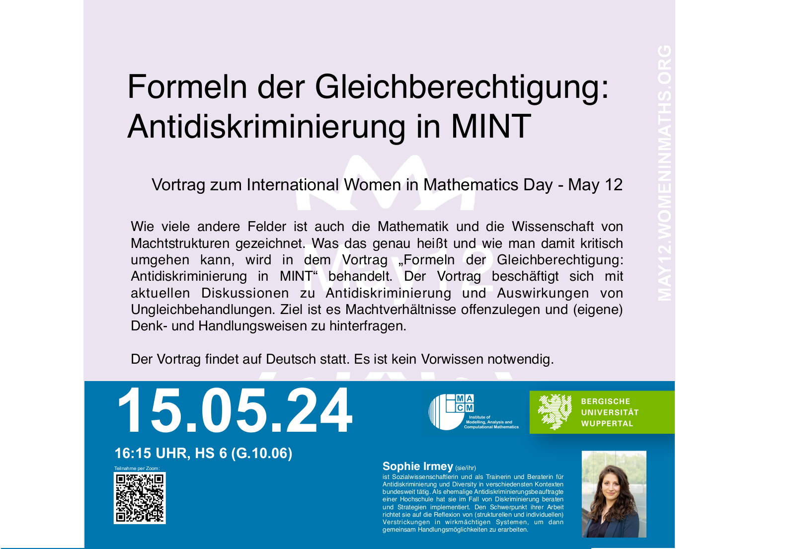 Auch wenn die Veranstaltung am 15. Mai stattfindet, nimmt das IMACM den 12. Mai zum Anlass, um über die Gleichstellung der Geschlechter in der Mathematik nachzudenken. Sophie Irmey wird einen Vortrag halten zum Thema "Formeln der Gleichberechtigung: Antidiskriminierung in MINT''.